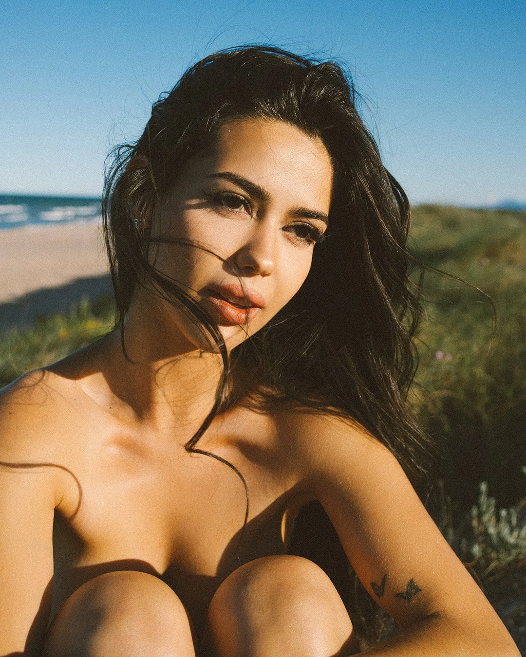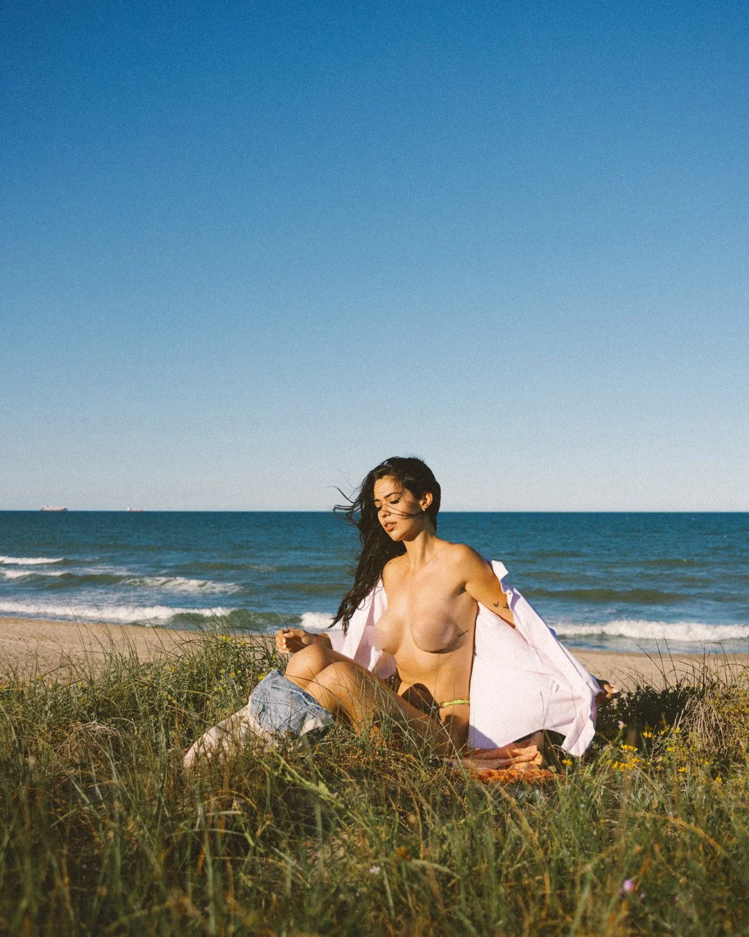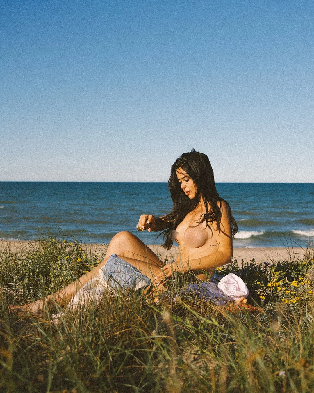 She wore tiny denim shorts and a hot pink bikini top with lime green trim. The strings cut gently across her chest, pulling her breasts higher, rounder, catching the sun like polished fruit, like she’d been styled by the heat itself.